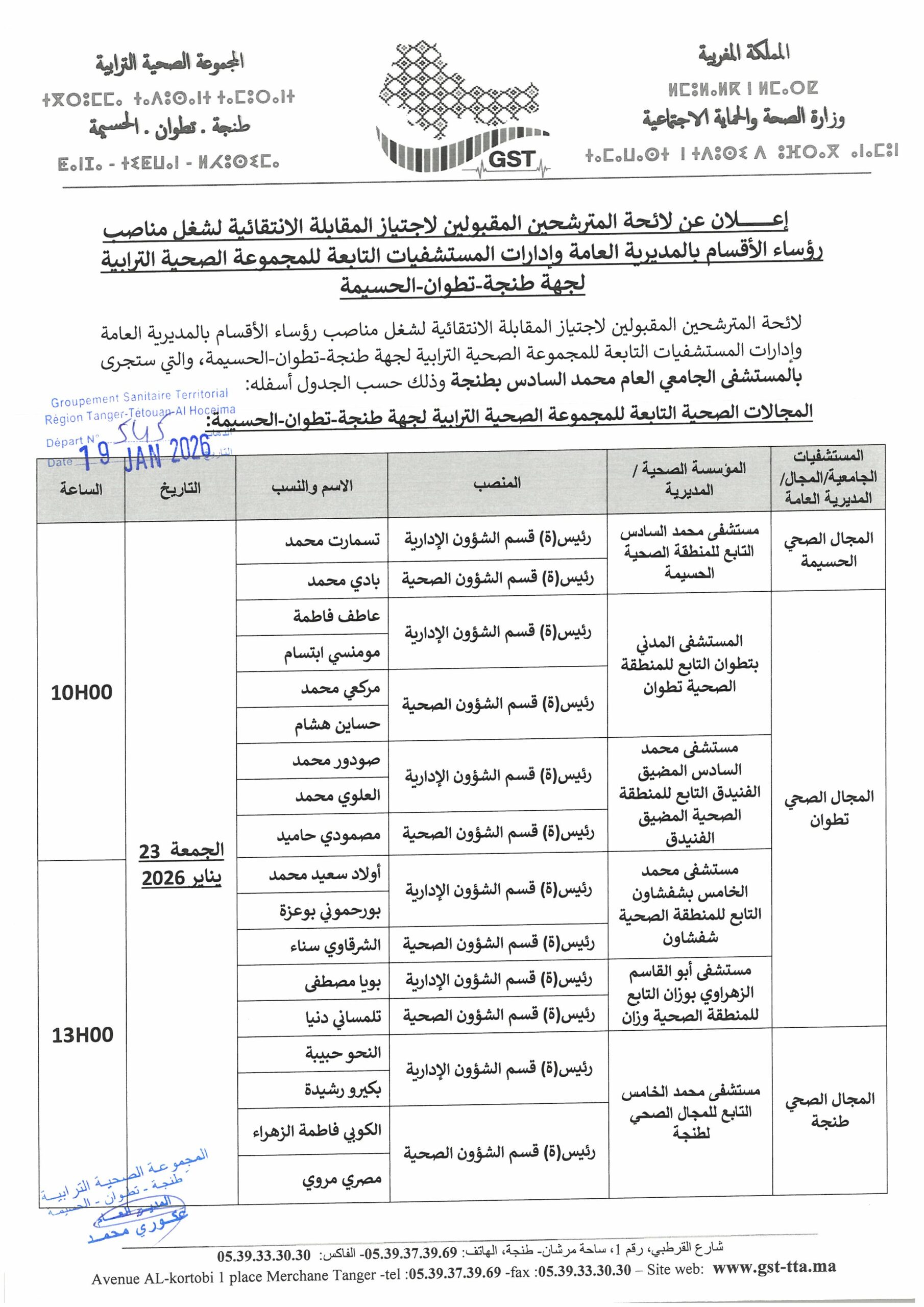 إعـلان عن لائـحة المترشحين المقبولين لاجتياز المقابلة الانتقائية لشغل مناصب رؤساء الأقسام بالمديرية العامة وإدارات المستشفيات التابعة للمجموعة الصحية الترابية لجهة طنجة-تطوان-الحسيمة
