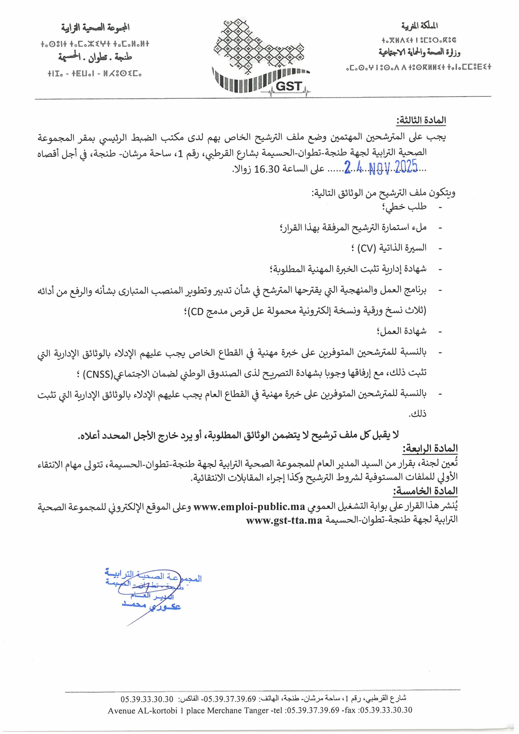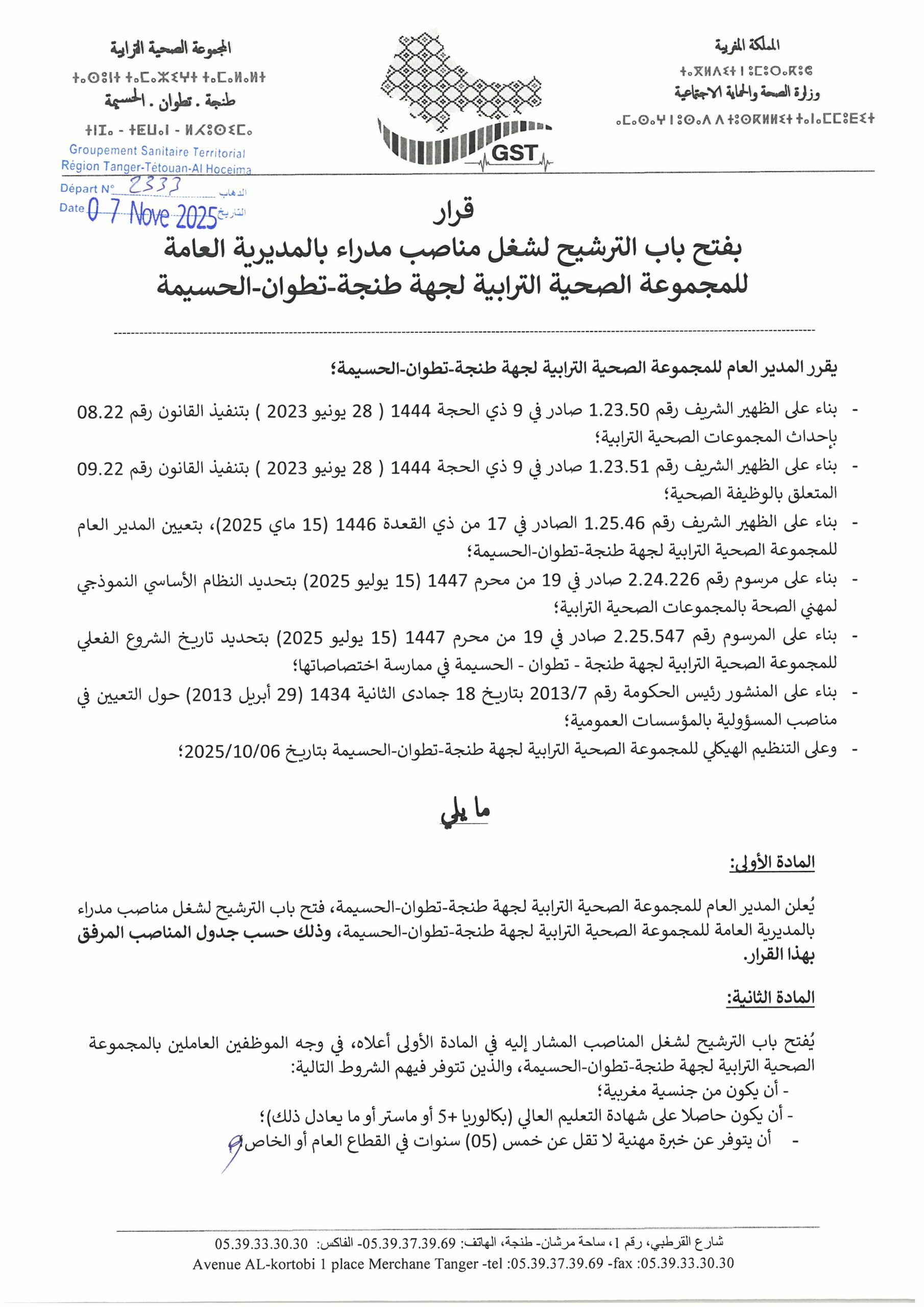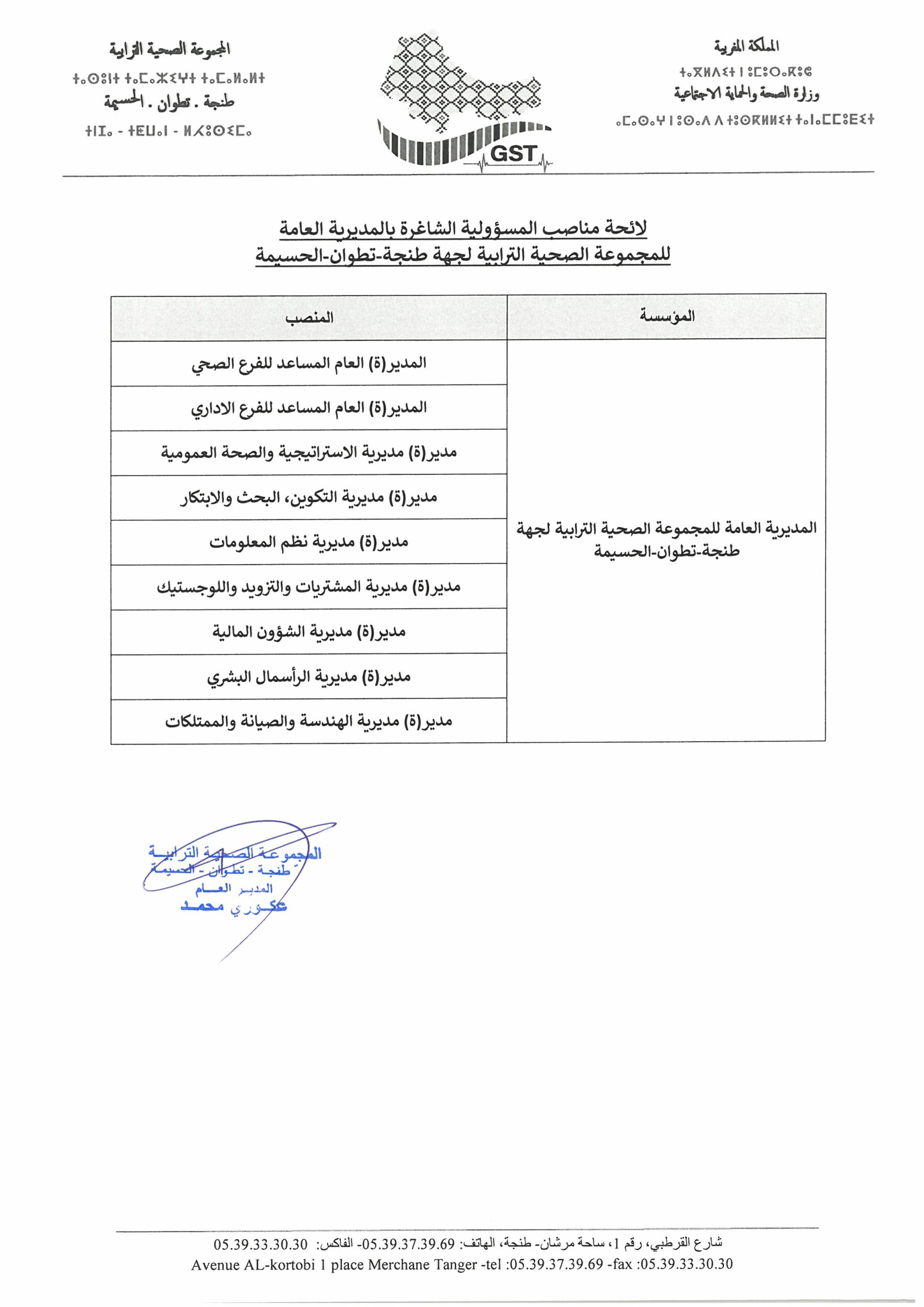 قرار بفتح باب الترشيح لشغل مناصب مدراء بالمديرية العامة للمجموعة الصحية الترابية لجهة طنجة-تطوان-الحسيمة
