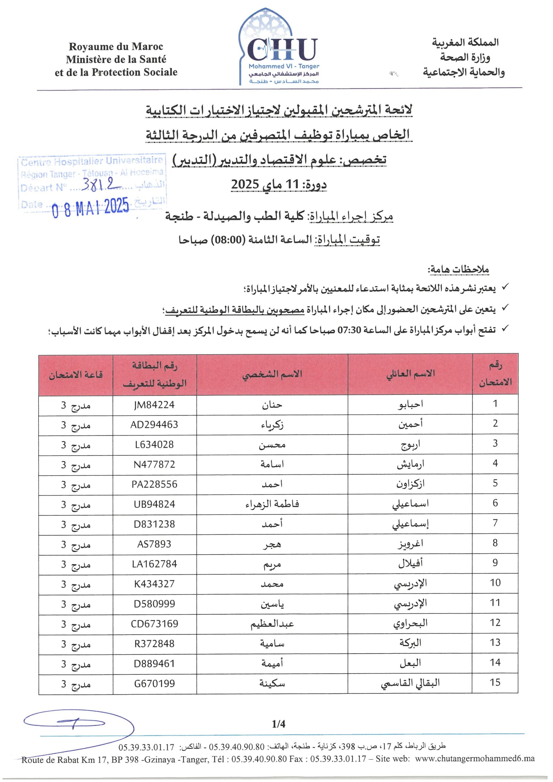 لائحة المترشحين المقبولين لاجتياز الاختبارات الكتابية الخاصة بمباراة التوظيف المتصرفين من الدرجة الثالثة تخصص: علوم الاقتصاد والتدبير (التدبير)