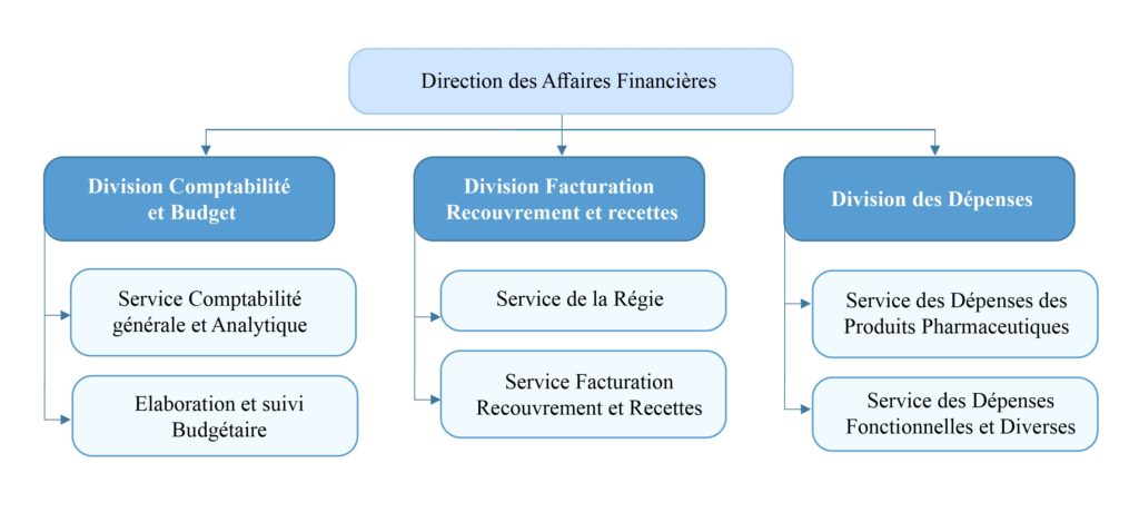La Direction des Affaires Financières supervise l’ensemble des fonctions budgétaires, comptables, de régie, de facturation et de recouvrement. Elle veille à la régularité et la performance de la gestion financière du GST, en assurant la conformité aux textes réglementaires et en facilitant l’atteinte des objectifs sanitaires régionaux. Elle comprend :