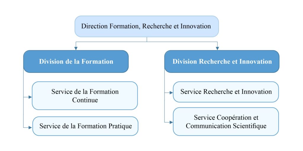 La Direction Formation, Recherche et Innovation pilote la stratégie du développement des compétences, de la recherche scientifique et de l’innovation au sein du Groupement. Elle œuvre à renforcer les capacités des professionnels de santé, à promouvoir la recherche appliquée et à favoriser l’ouverture scientifique et technologique. . Division de la Formation: