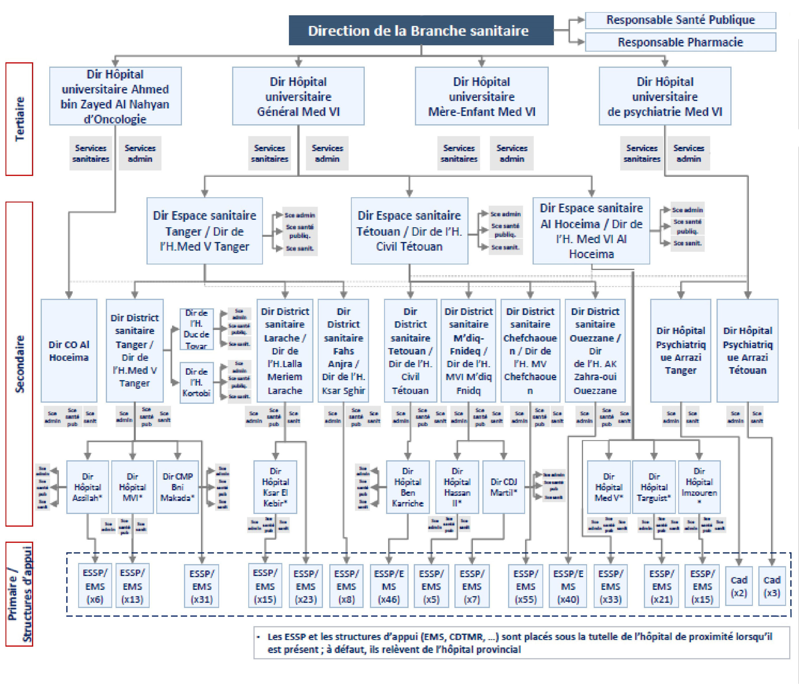 • Les espaces sanitaires et districts sanitaires (niveau secondaire), organisés par sous-territoire (Tanger, Tétouan et Al Hoceima),