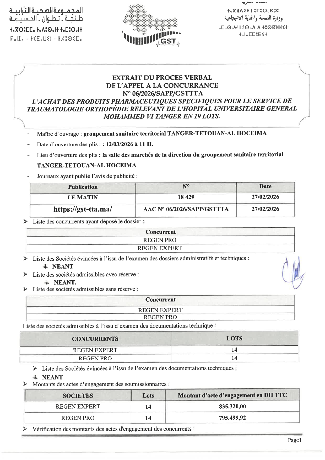 EXTRAIT DU PROCES VERBAL DE L’APPEL A LA CONCURRANCE N° 06/2026/SAPP/GSTTTA