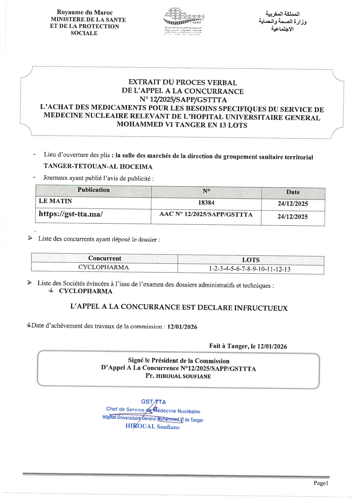EXTRAIT DU PROCÈS-VERBAL DE L’APPEL À LA CONCURRENCE N° 12/2025/SAPP/GSTTTA