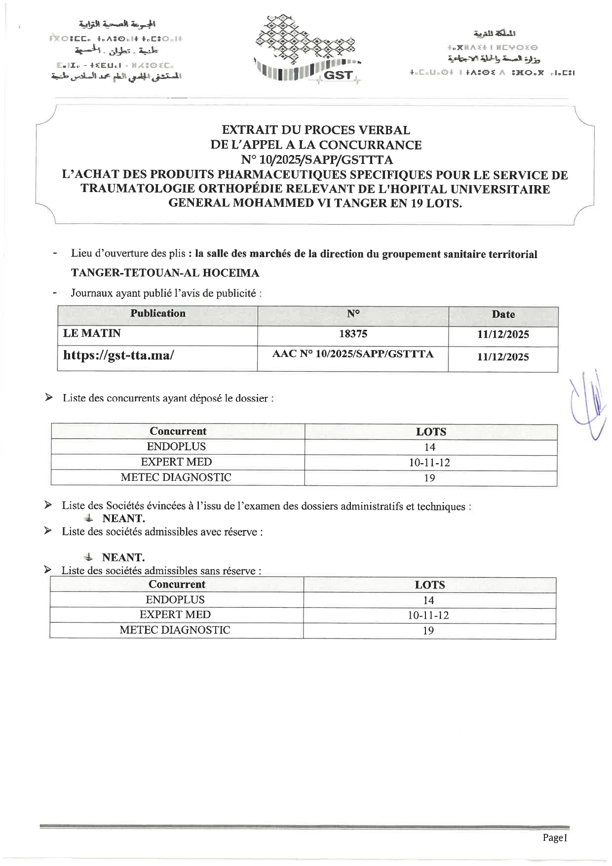 EXTRAIT DU PROCÈS-VERBAL DE L’APPEL À LA CONCURRENCE N°AAC 10/2025/SAPP/GSTTTA: L’ACHAT DES PRODUITS PHARMACEUTIQUES SPECIFIQUES POUR LE SERVICE DE TRAUMATOLOGIE ORTHOPÉDIE RELEVANT DE L’HOPITAL UNIVERSITAIRE GENERAL MOHAMMED VI, TANGER EN 19 LOTS.