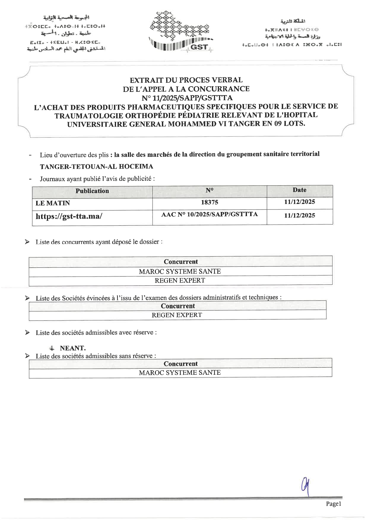 EXTRAIT DU PROCÈS-VERBAL DE L’APPEL À LA CONCURRENCE N°AAC 11/2025/SAPP/GSTTTA: L’ACHAT DES PRODUITS PHARMACEUTIQUES SPECIFIQUES POUR LE SERVICE DE TRAUMATOLOGIE ORTHOPÉDIE PEDIATRIQUE RELEVANT DE L’HOPITAL UNIVERSITAIRE GENERAL MOHAMMED VI TANGER EN 09 LOTS.